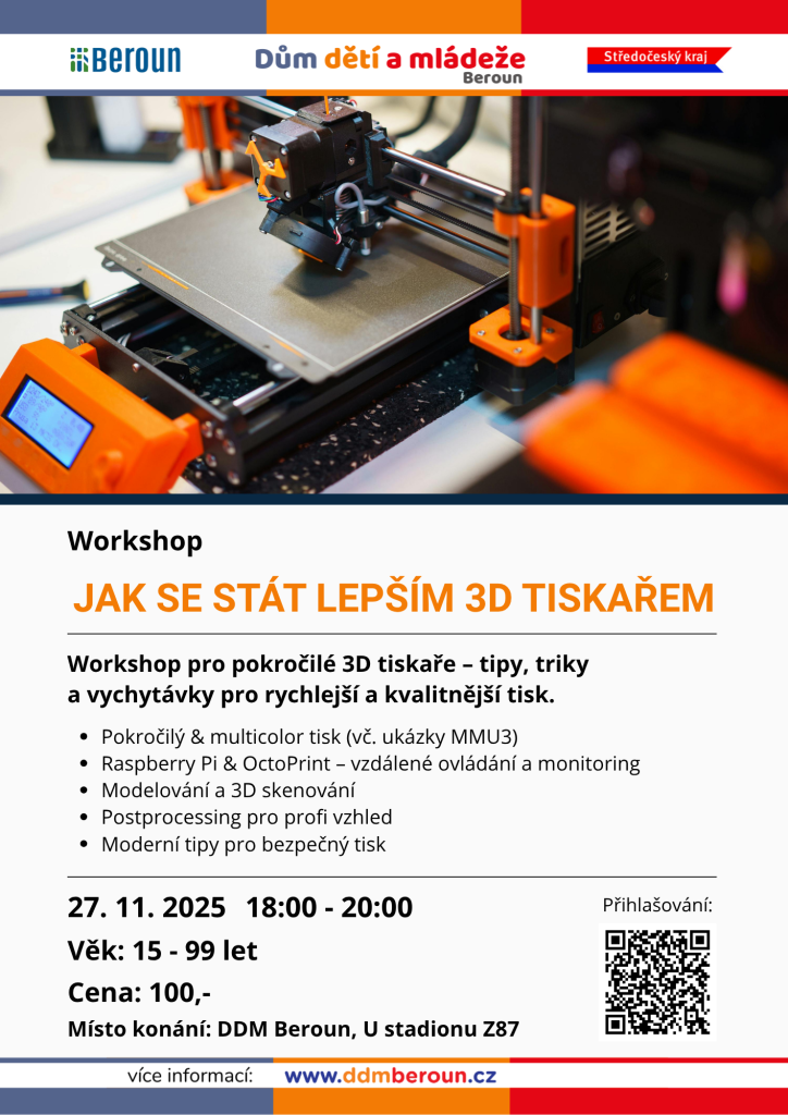 Chceš posunout svůj 3D tisk na vyšší úroveň? Přijď na workshop, kde ti ukážeme tipy, triky a moderní vychytávky pro zkušenější tvůrce a nadšence. Akce je určena pro všechny, kdo už znají základy 3D tisku a chtějí se naučit víc, zrychlit práci a získat kvalitnější výsledky.