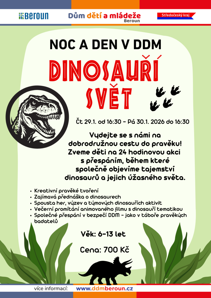 Zveme děti ve věku 6–13 let na 24 hodinovou akci s přespáním, během které společně objevíme tajemství dinosaurů a jejich úžasného světa.
